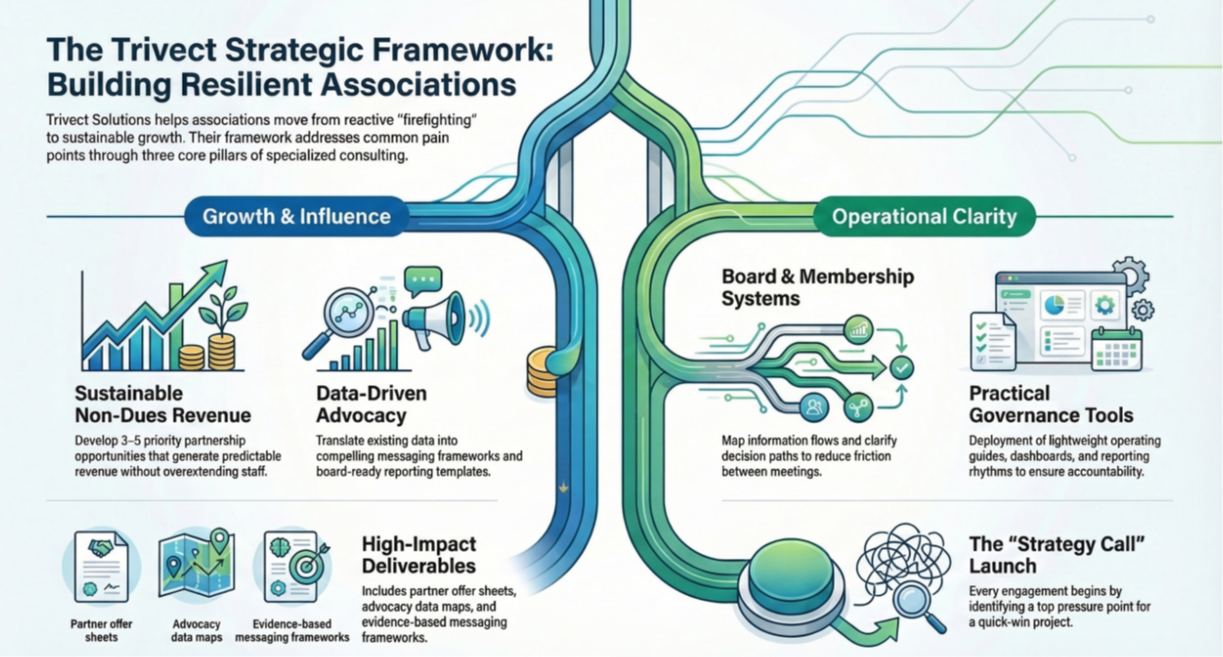 Associations don’t need another overwhelming strategic plan. You need clear priorities, realistic projects, and support that respects your staff and board capacity. Trivect Solutions focuses on three services that directly support your mission, your members, and your bottom line.
